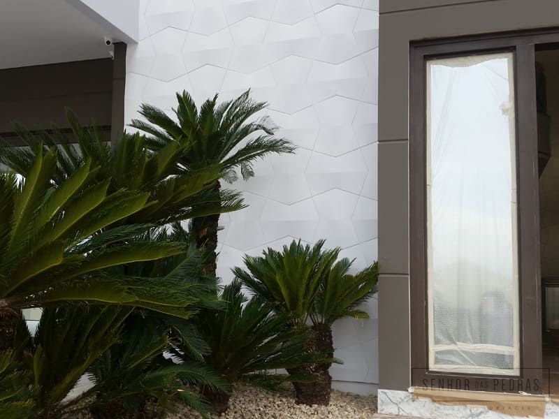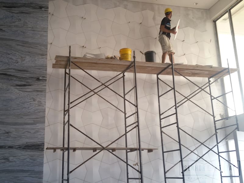 Um projeto sofisticado e que destaca o tridimensional: essa obra está sendo finalizada, com destaque para o revestimento da linha Faces, aplicado na fachada e na parede interna da sala. É muito satisfatório para uma marca acompanhar esses processos da obra, pois é o momento em que é possível verificar todas as etapas envolvidas na fabricação e aplicação dos revestimentos.