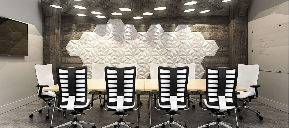 A linha Hexa tem a geometria e a tridimensionalidade como inspirações para suas peças. Este revestimento forma um mosaico único na parede, podendo ser usado para destacar diversos ambientes, como escritórios e salas.